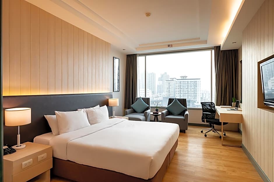 2 CONNECTED DELUXE WITH BALCONY is 592 square feet and includes either a king-size bed 150-183 width or a single bed 80-130 width plus balcony, satellite tv , hairdryer, safe, and slippers.